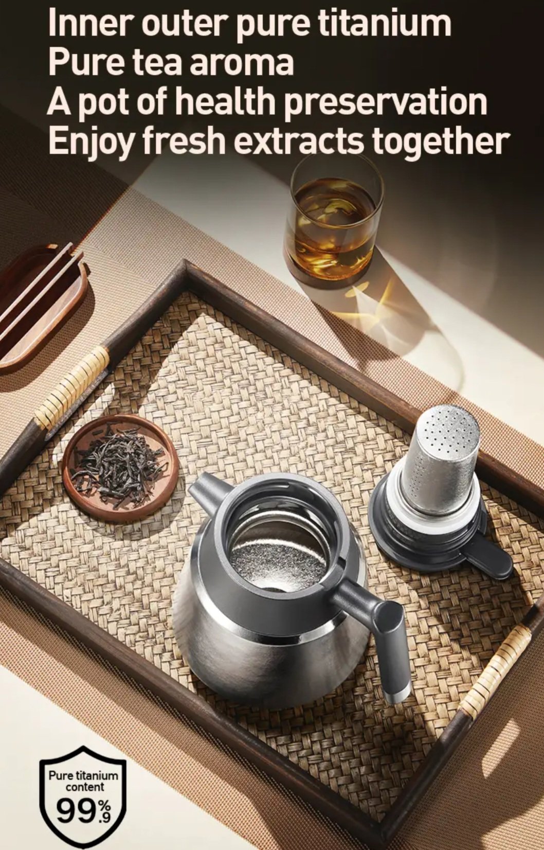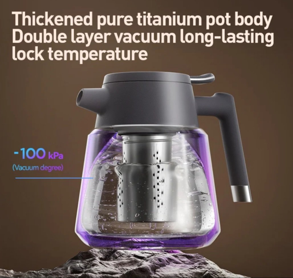 دلة شاي مصنوعة من التيتانيوم النقي 99.9% — يحافظ على نكهة الشاي كما هي، دون أي تفاعل أو تغيّر.